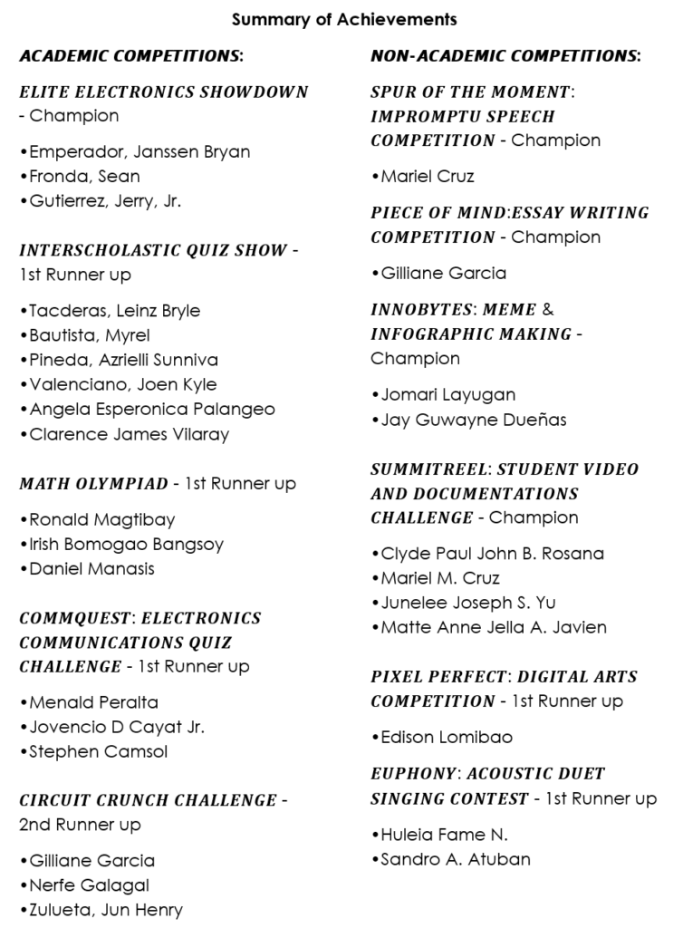 The UC delegation showcased exceptional technical mastery, securing the championship title in the Elite Electronics Showdown 2025, while also earning several runner-up spots in major categories such as the Interscholastic Quiz Show, Math Olympiad, and CommQuest. Their performance demonstrated not only intelligence and skill but also teamwork and innovation in solving complex engineering problems.